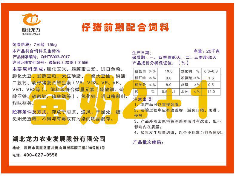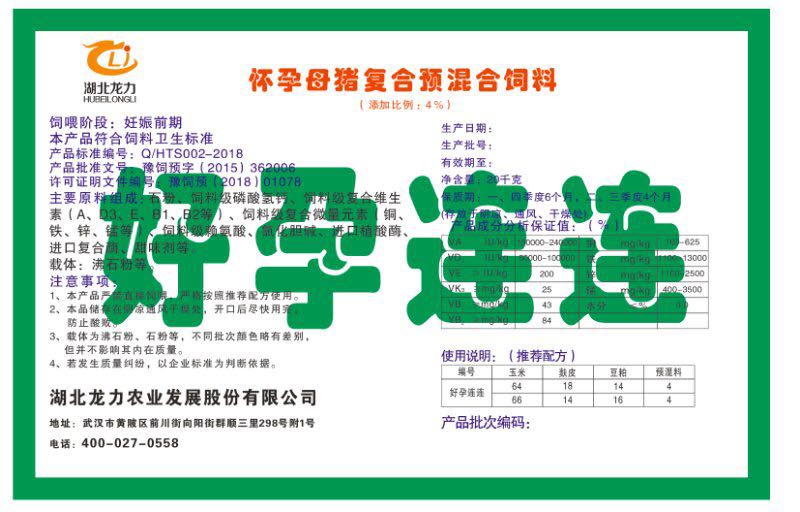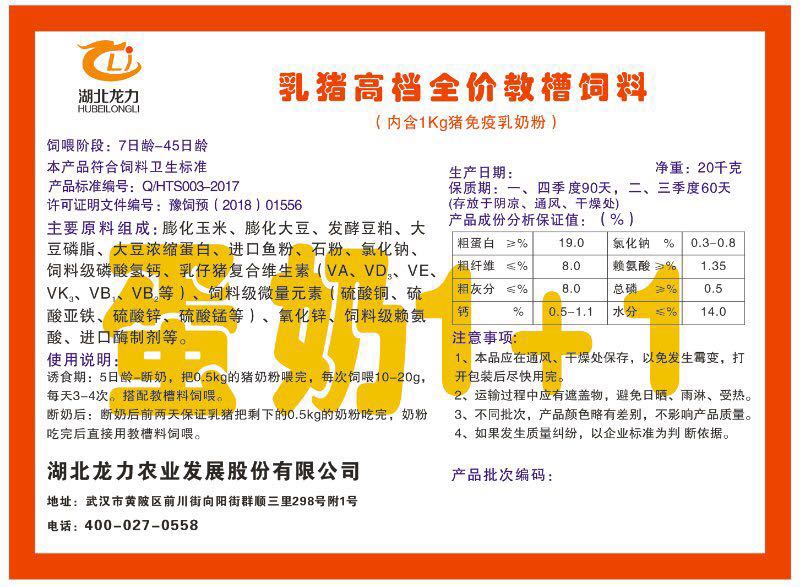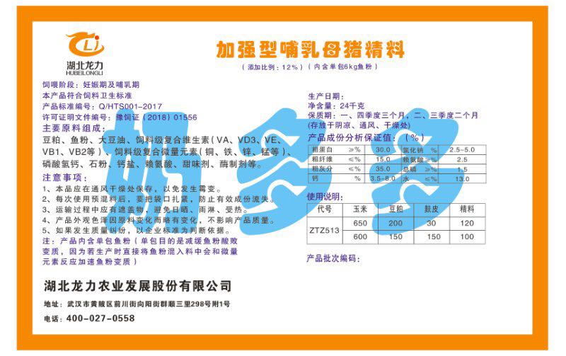 湖北龍力農(nóng)業(yè)發(fā)展股份有限公司坐落于武漢市黃陂區(qū)前川街向陽街群順三里298號附1號。公司成立于2014年6月,公司自成立以來把“創(chuàng)全球最大養(yǎng)豬綜合服務(wù)”為企業(yè)愿景。致力于打造教保料品牌”作為公司發(fā)展的明確目標。公司一直致力于豬營養(yǎng)的研究和開發(fā),積極與國內(nèi)外高校和科研機構(gòu)合作,推廣養(yǎng)豬技術(shù)、動物營養(yǎng)新概念,向世界農(nóng)牧企業(yè)學(xué)習(xí)與合作。公司采用國內(nèi)先進的生產(chǎn)工藝,選擇高精度電子配料秤,高均勻度、無殘留混合機等先進設(shè)備....